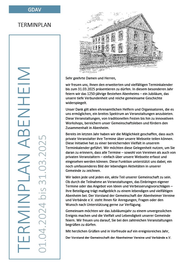 Hier ist der neue Terminplan für den Zeitraum vom 01.04.2024 bis zum 31.03.2025. Die Abenheimer Vereine und Verbände haben erneut große Anstrengungen unternommen, um unseren Ort mit zahlreichen Veranstaltungen und Festen zu bereichern. Der Online-Kalender wurde auch schon mit den neuen Daten aktualisiert. Wenn Sie diesen abonniert haben, sollten die Informationen bereits auf dem neuesten Stand sein. Die Verteilung der gedruckten Version ist derzeit im Gange. Unser Dank gilt Hedi und Len Killick für die Zustellung.